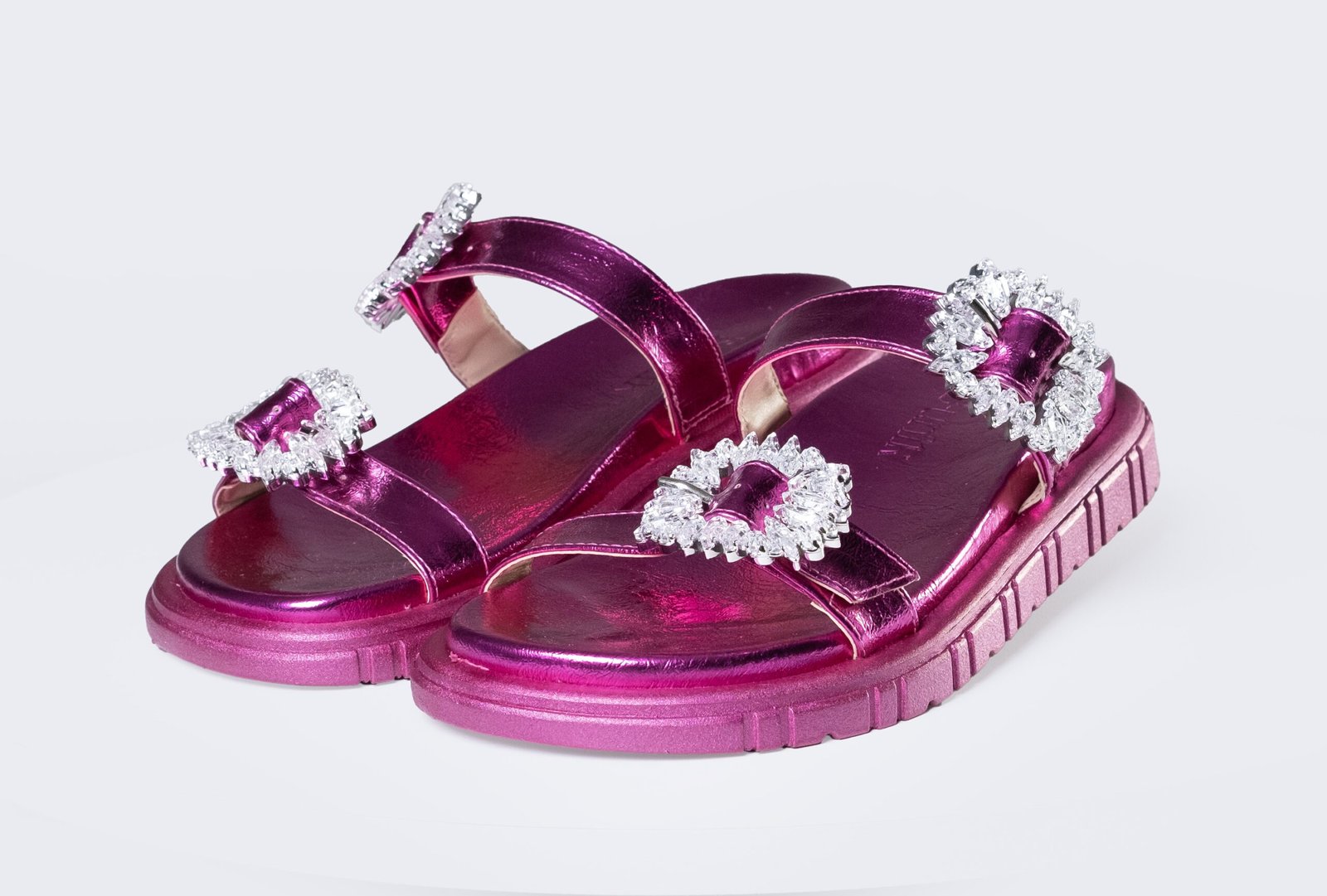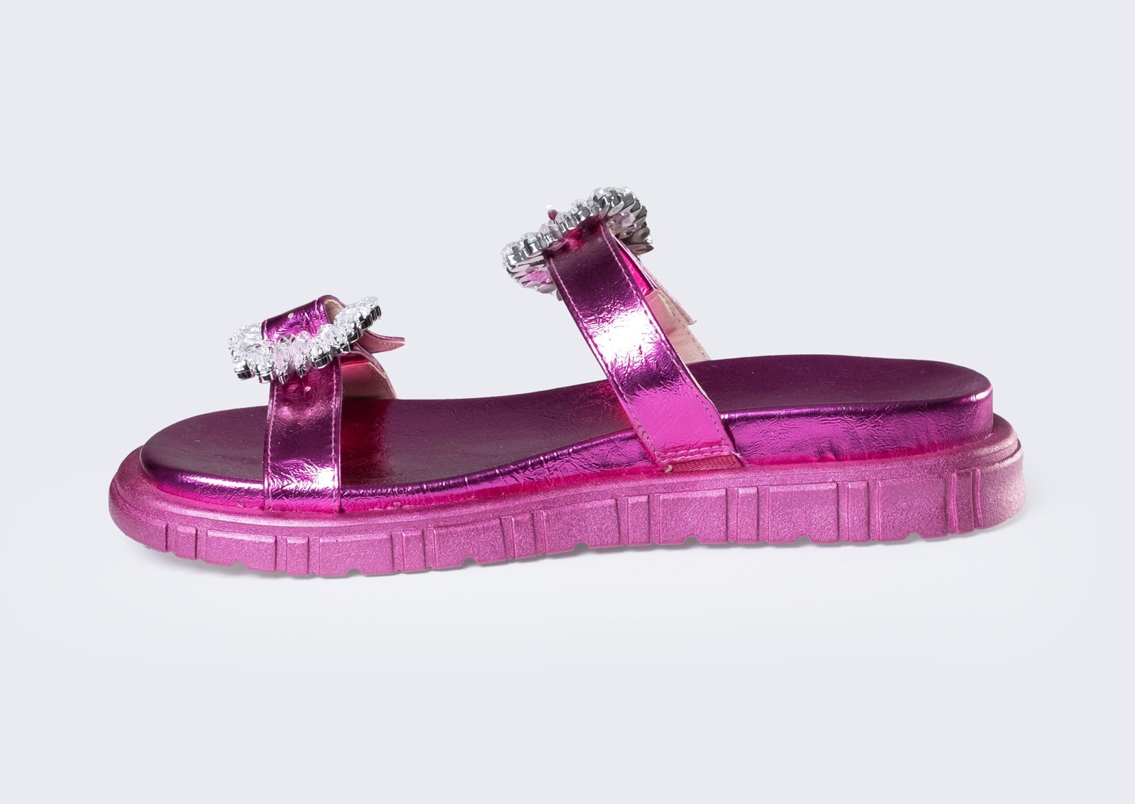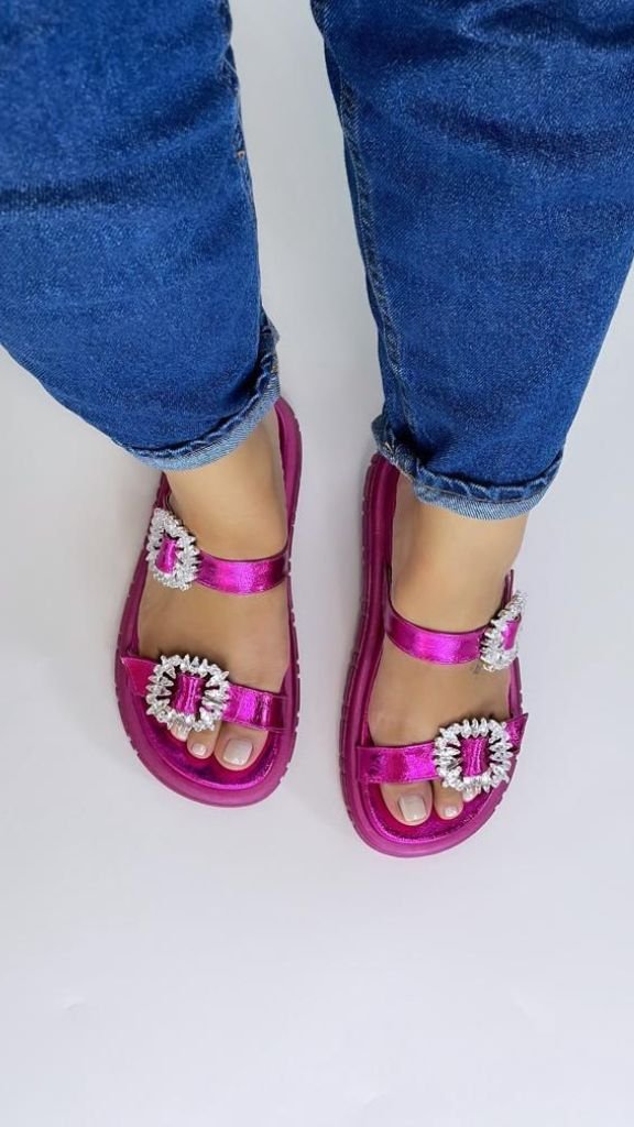 Material sintético. Cabedal com tiras largas, fivela em resina com tira ajustável.