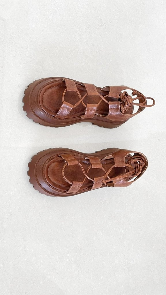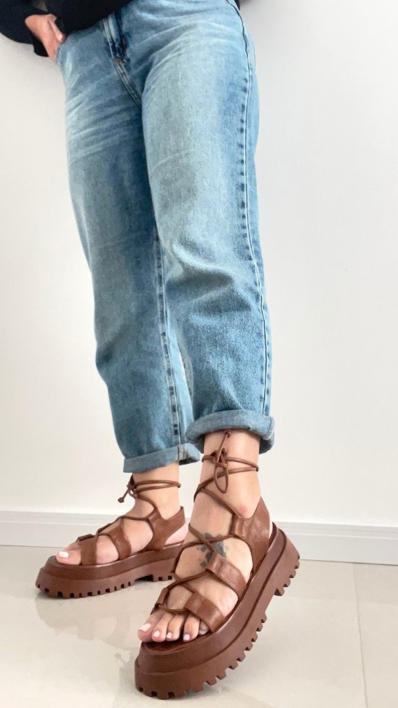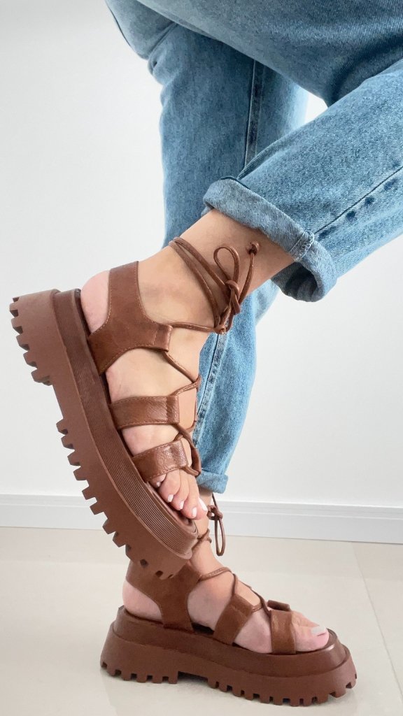 Sandália em material sintético com tiras para amarração, solado tratorado de borracha.